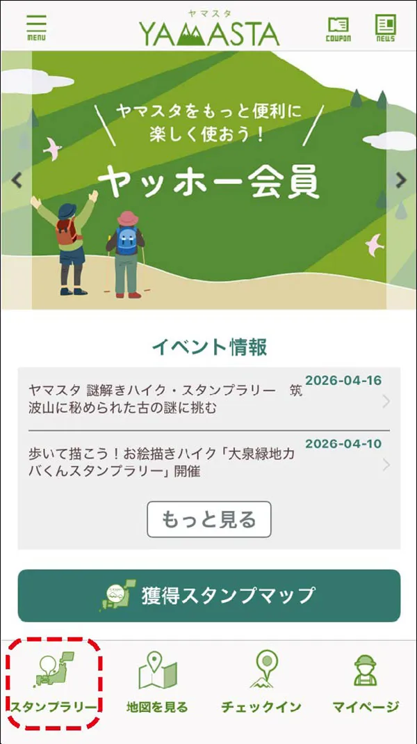 ①ヤマスタアプリTOP画面下の「スタンプラリー」をタップします。
