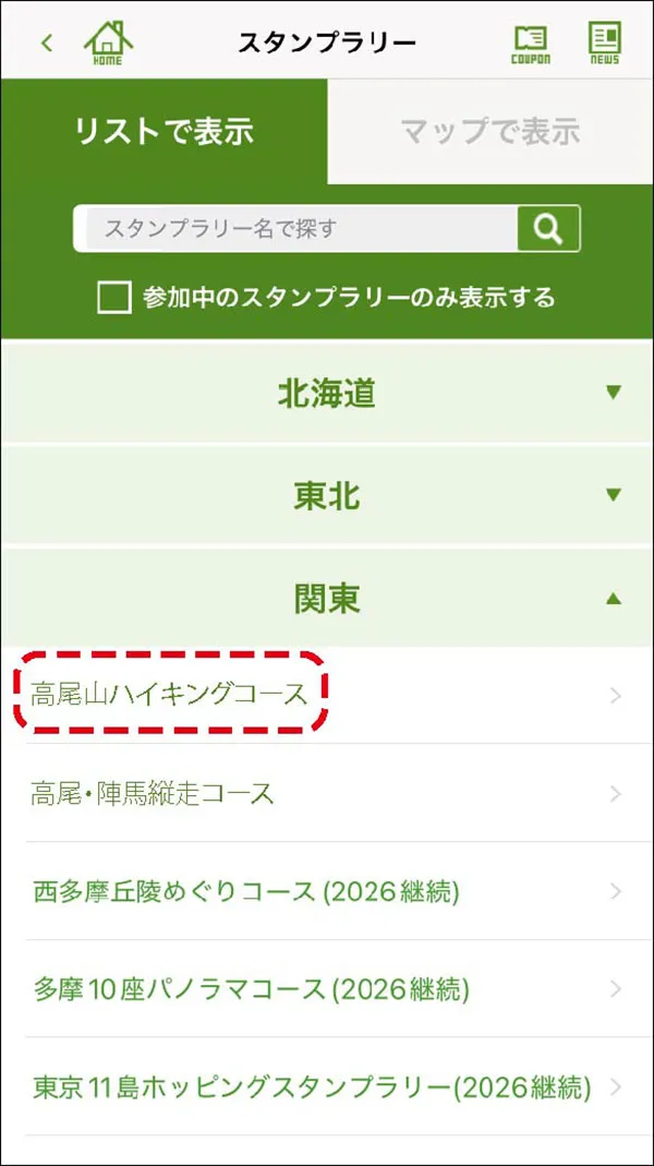 ②「関東」の中から、「高尾山ハイキングコース」または「高尾・陣馬縦走コース」を選択します。