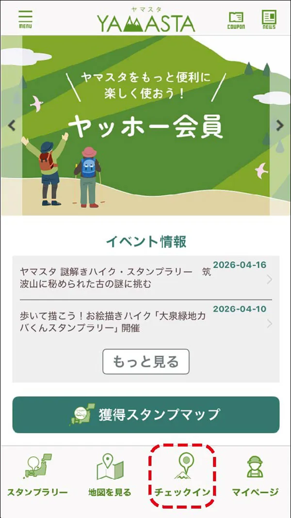 ①スタンプラリー対象の場所に着いたら、ヤマスタアプリを立ち上げて「チェックイン」をタップします。