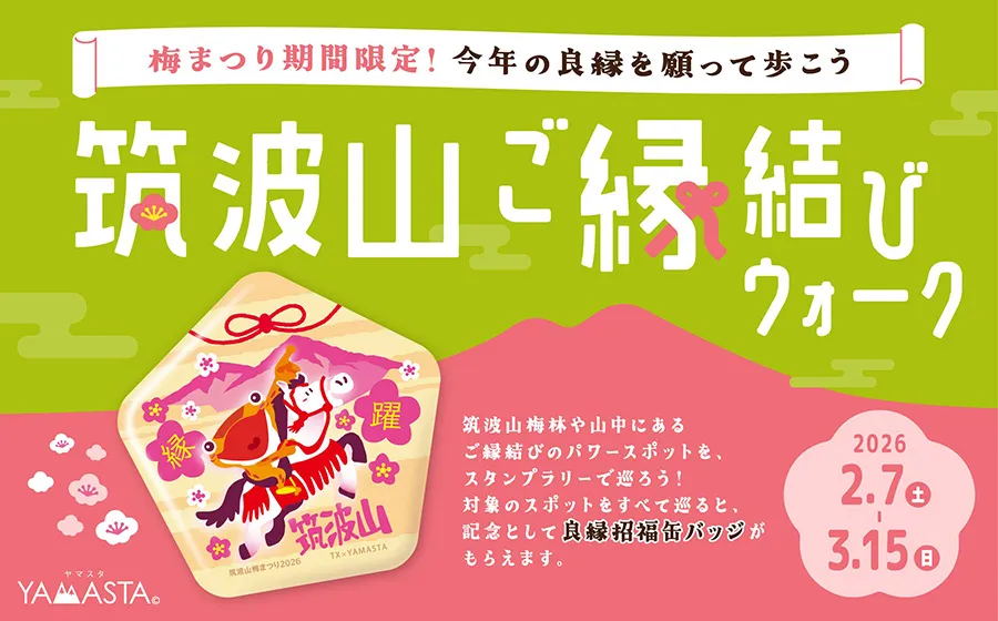 筑波山梅まつり期間中の2026年2月7日(土)~3月15日(日)に、筑波山スタンプラリーのいずれかのコースを達成すると、達成記念特典に加えて「良縁招福缶バッジ」がもらえる「筑波山ご縁結びウォーク」を開催します。